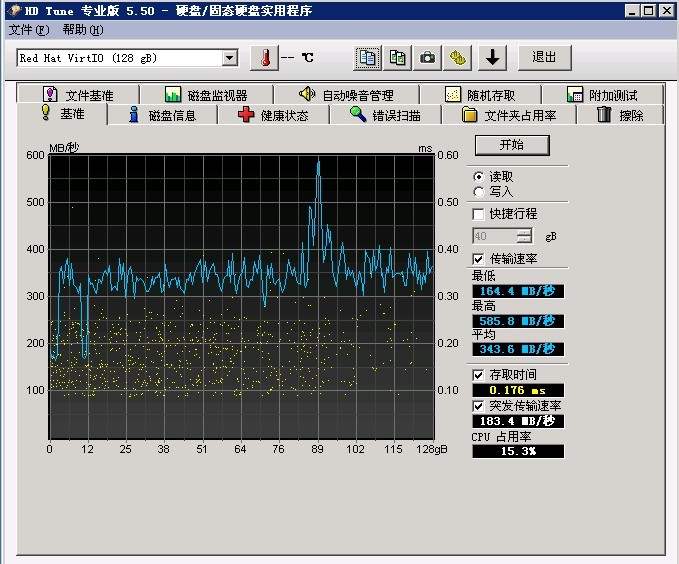 吞吐量主要指大文件的连续读写速度,在大文件的复制、备份等场景适用,用“HD Tune专业版”中的“基准”测试功能即可测试出磁盘的吞吐量,一般传统机械sata硬盘的顺序读写速度为
